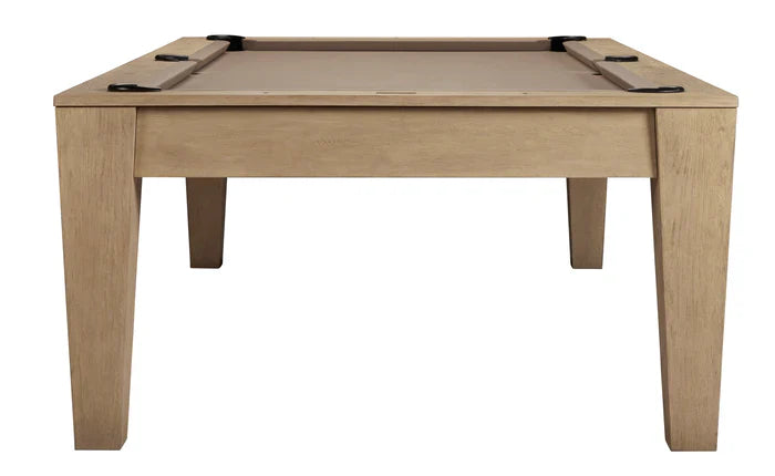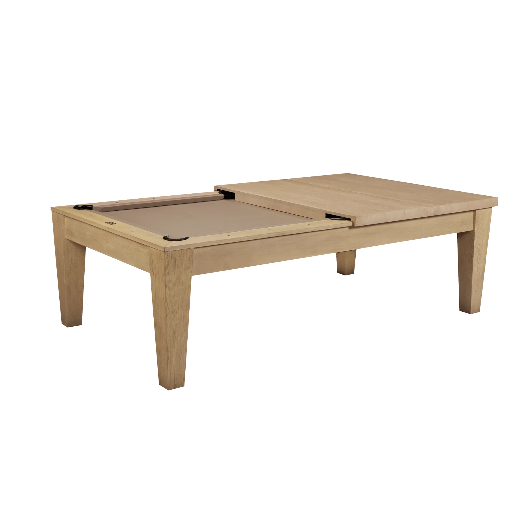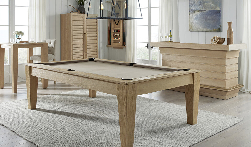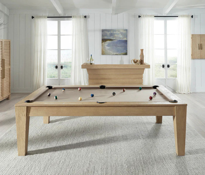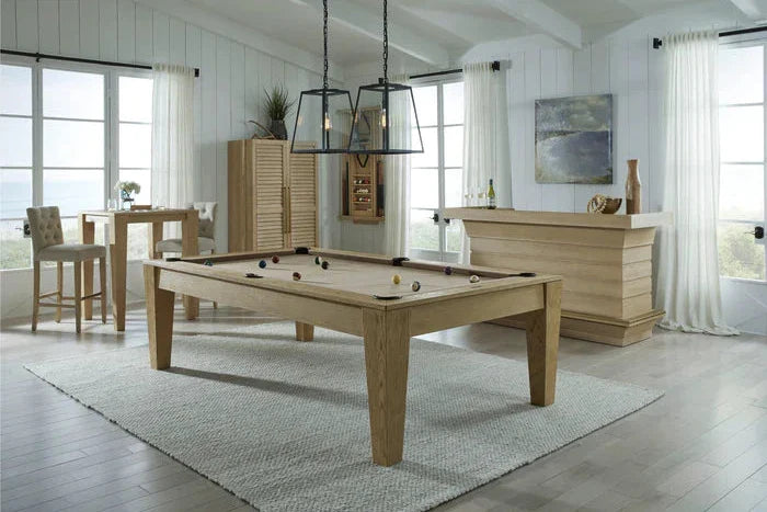 The Aberdeen Pool Table is a modern farmhouse style piece finished in white wash natural oak wood. The Port Royal is formed in solid White oak hardwood and features tournament K66 gum rubber cushions, 1" three piece matching slate play surface, modern drop pockets, and a limited lifetime warranty for both residential and commercial applications. A matching wood dining top and storage bench seating are also available.