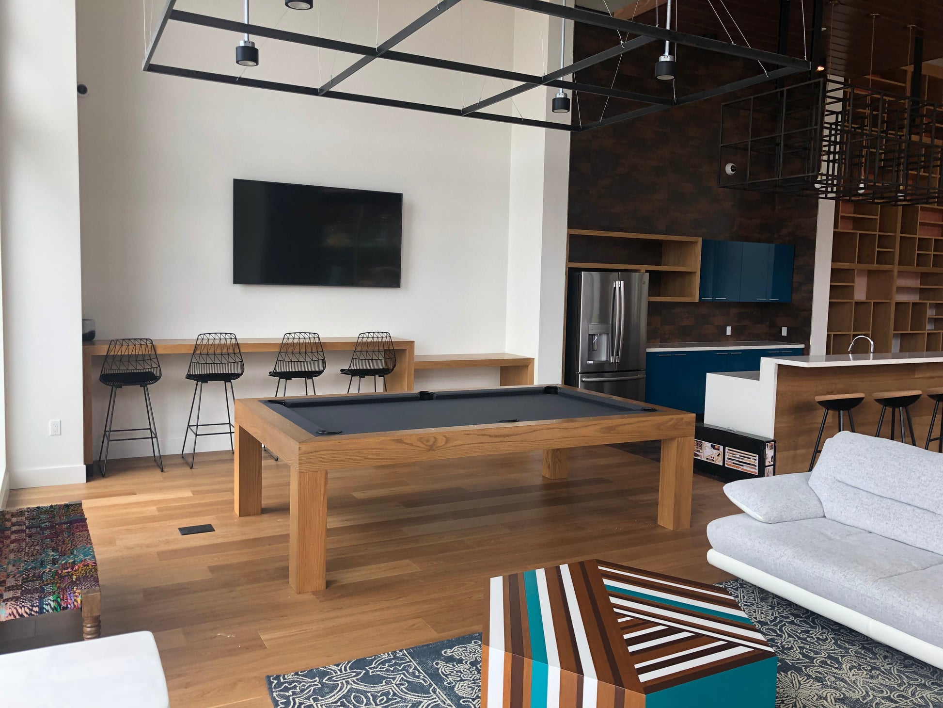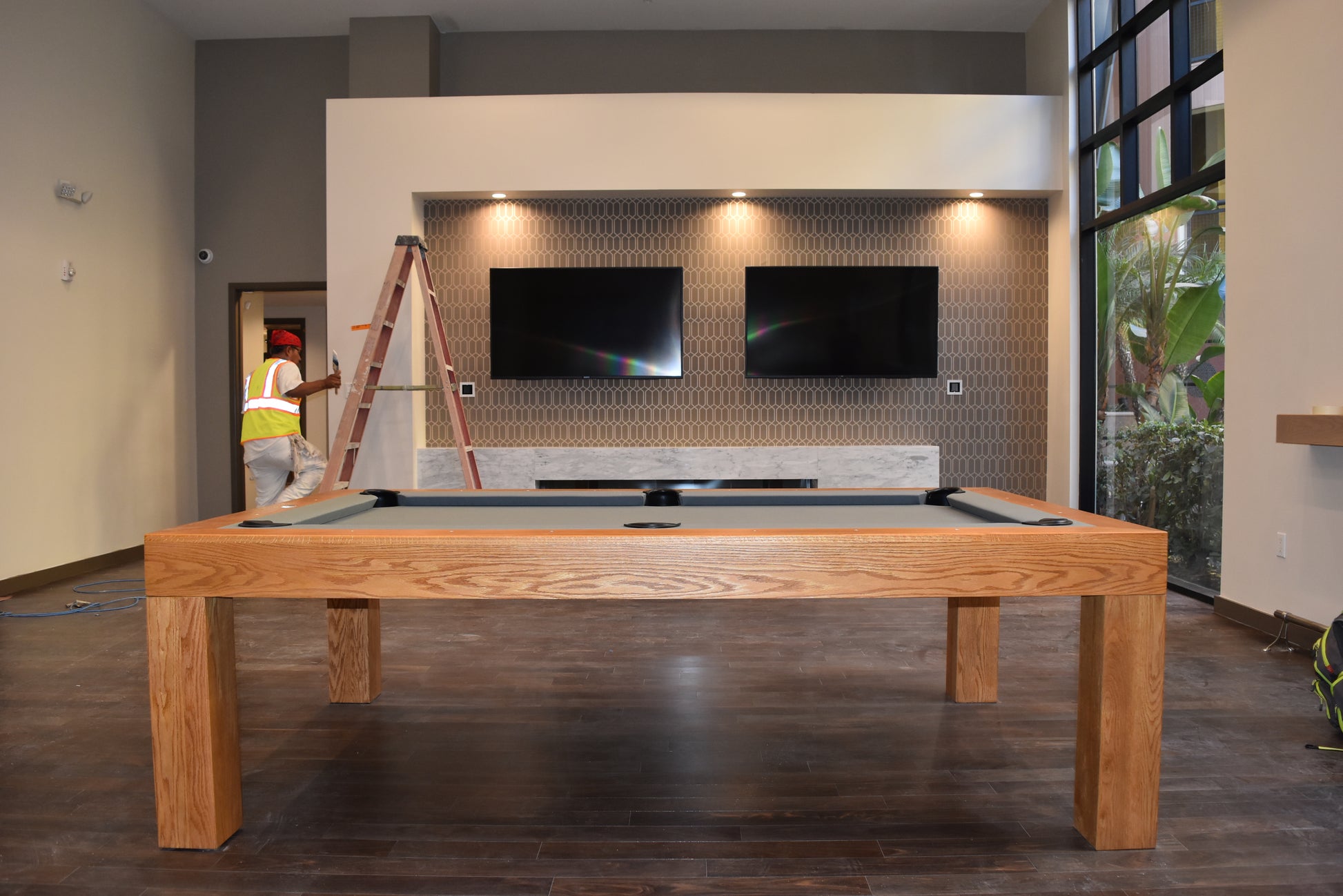 This Modern Pool Tables are made with solid wood, 1" thick diamond honed slate, maple wood frame construction, leather drop pockets, any color felt at you choose with optional Tournament cloth, super speed cushions k-66 100% gum rubber.