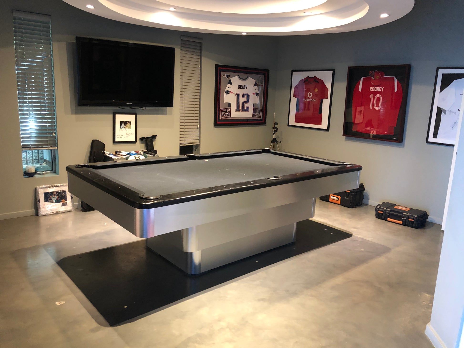This Modern Pool Tables are made with solid wood Rails, 1" thick diamond honed slate, maple wood frame construction, leather drop pockets, any color felt at you choose with optional Tournament cloth, super speed cushions k-66 100% gum rubber.