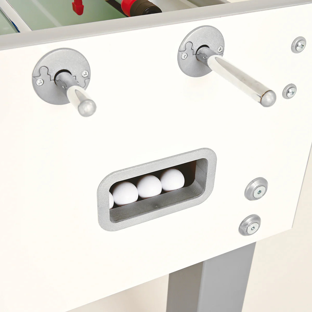 The table features a sturdy 1.2" MDF cabinet finished in crisp white with the ITSF logo. Its 4" x 4" square metal legs include adjustable feet, ensuring a perfectly level playfield on any surface. The 16mm anti-rust steel rods are highly resistant to twisting, even during intense matches. Steel ball bearings and updated shock-absorbing bumpers deliver smooth, fast movement and reduce impact during play.