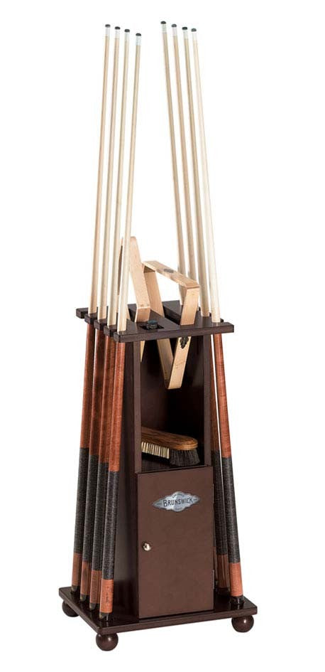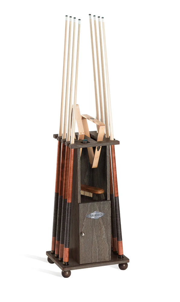 The free-standing Heritage Floor Cue Rack is the perfect solution for your billiard storage needs. Designed to hold up to eight cues, two ball racks, chalk, table brush, and additional accessories. Available in black,coffee, espresso, nutmeg, tuscana, driftwood,natural hickory, rustic dark brown and rustic grey finishes. Some assembly required.
