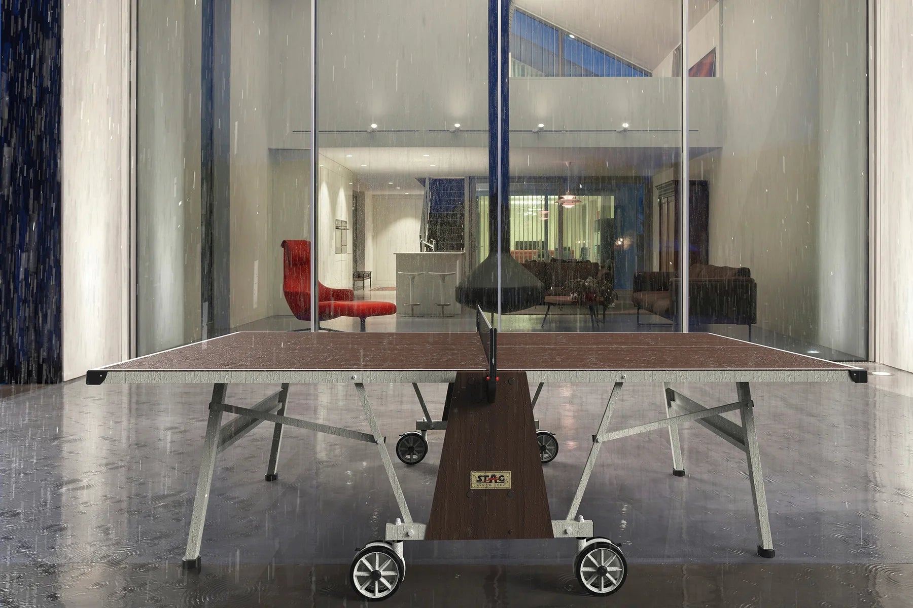 The STAG Kona Outdoor table is ideal for home and commercial use due to its excellent craftsmanship. The design of the table features centerfold technology and a proprietary PRO-TEC5 Outdoor top in matte finish for anti-glare. The very durable table top provides a consistent ball bounce and enhanced performance during play. The Kona Outdoor is perfect for anyone looking to take their table tennis skills, inside or outside, to a higher level. Setting up the Kona Outdoor table is simple and it already comes 80% pre-assembled out of the box (2 adults / approximately 30 min assembly time / Tools Included).