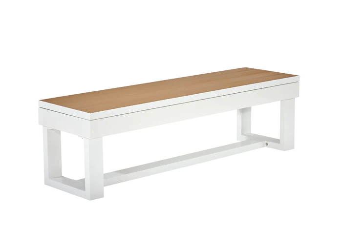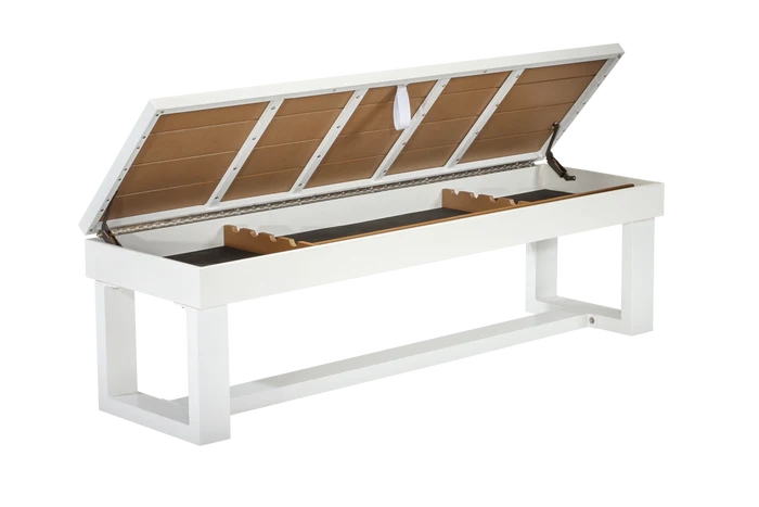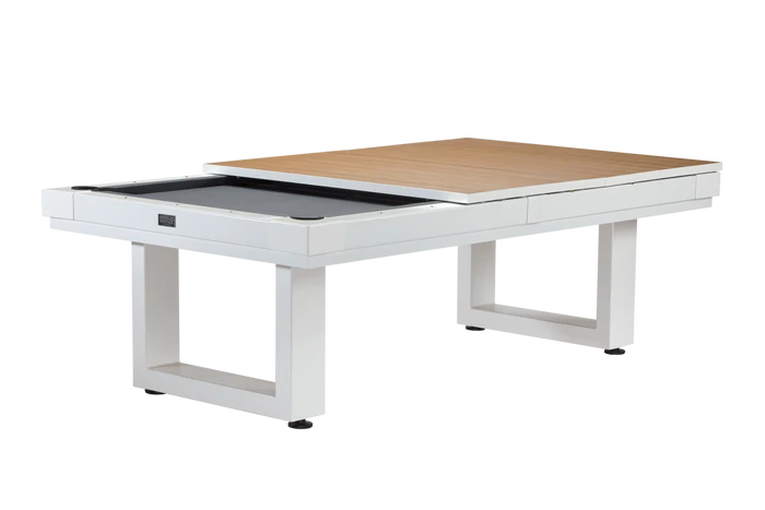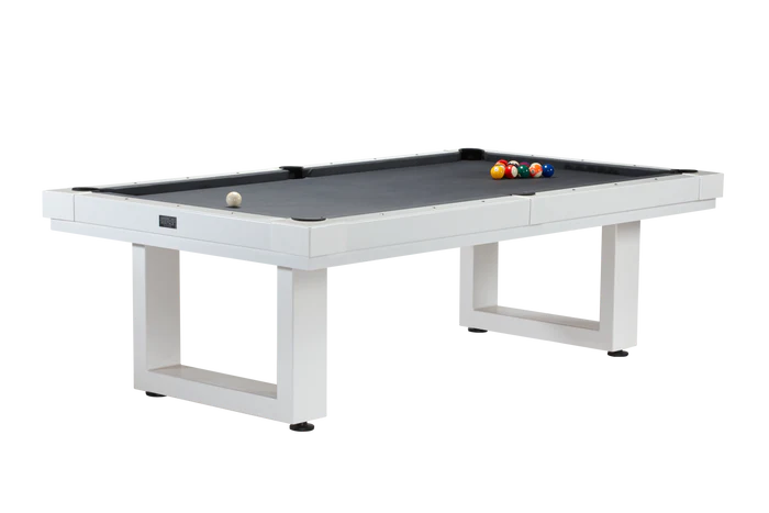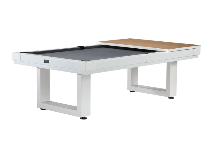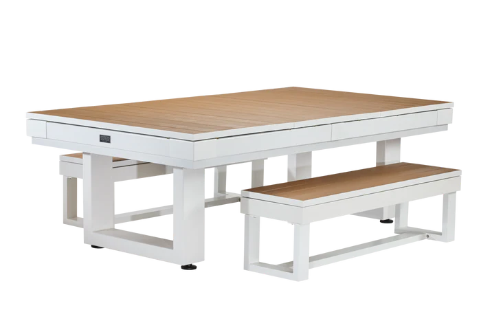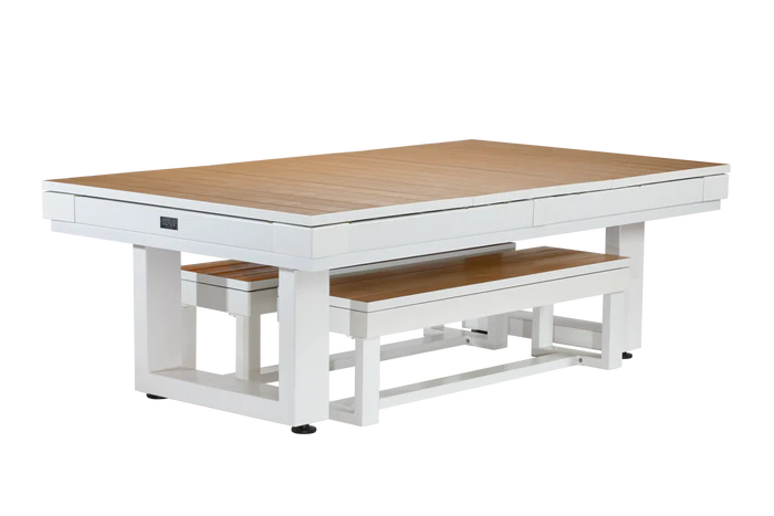Bring friends and family together this summer with the Lanai Outdoor Set! Built with furniture-grade wood composite material and a durable outdoor powder coat finish, this set includes an 8’ outdoor pool table and two coordinating storage benches. Transform the pool table into a dining table with the included matching dining conversion top. Plus, it comes with all the essentials – 2 outdoor cues, balls, rack, and chalk. Enjoy game night in the fresh air with the Lanai Outdoor Set!