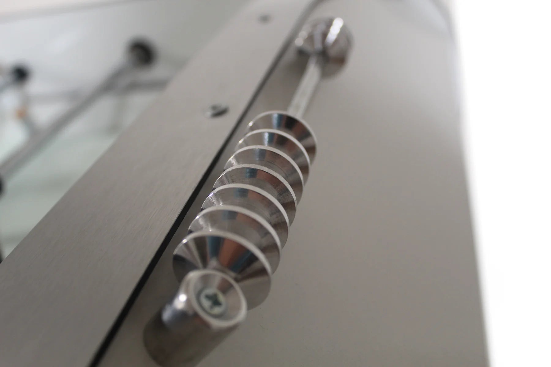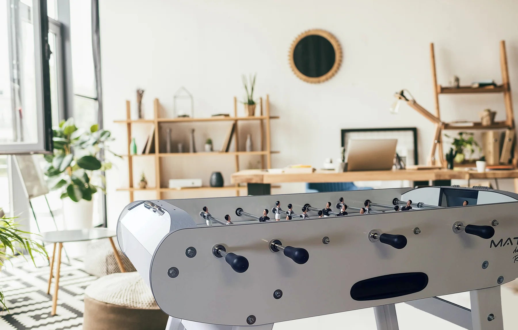 This updated classic enhances any game room. The René Pierre MATCH BLANC Foosball Table is designed and handmade in France. This solid table features a sturdy MDF cabinet with lacquered finish- Sloped corners in the play field keep the ball in play- Telescopic playing rods with ergonomic play handles and bumper springs- Die cast aluminum players are hand painted- Abacus style scoring units with metal score pieces- Insert able leg levelers (included) ensure a level play field. The table includes everything you need to get started and makes an attractive addition to any home game space.