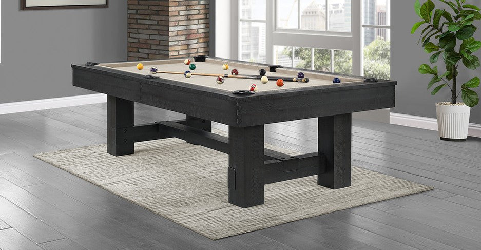 Reno pool table is made of solid wood . This table features leather internal drop pockets, metal coin rail sites, K66 cushion rubber for true rebound, and 1-inch backed K pattern slate for true roll. Solid wood post legs and crossbeam is a unique look and provides added stability.