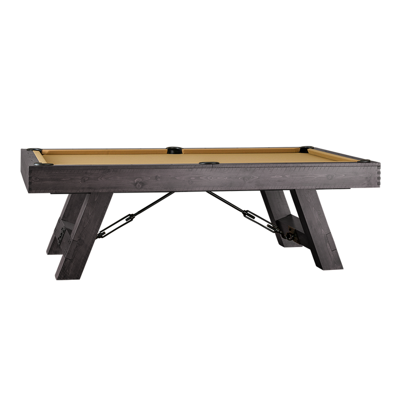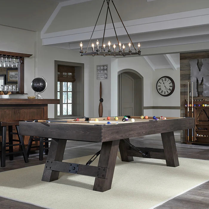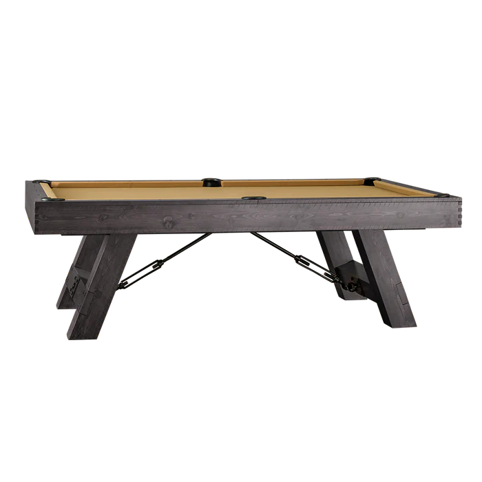 Discover the timeless charm of the Savannah Pool Table. With its classic farmhouse style and authentic details, including metal turnbuckles and elemental metal rings, this table brings a touch of vintage elegance to your game room. The rich charcoal finish adds warmth and character, while recessed black hex bolt metal rail sights provide a modern contrast. Crafted for superior performance, the Savannah features 1" three-piece certified slate and K66 premier cushion rubber, ensuring an exceptional gaming experience.