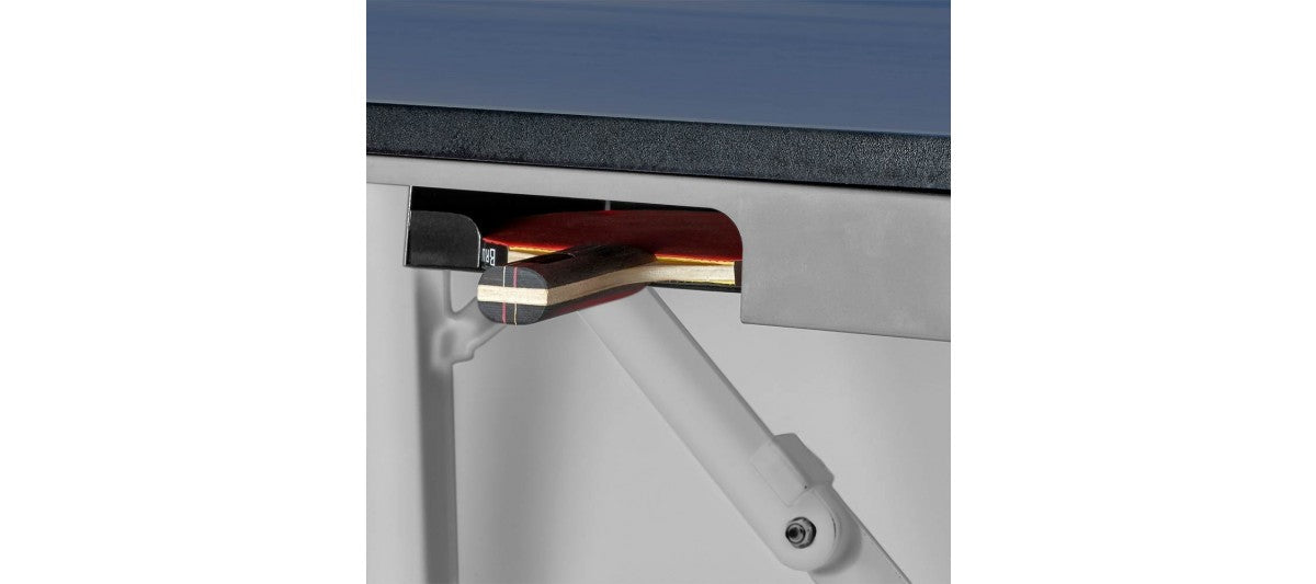 Our mid-range model features a dynamic blue playing surface with matching net and net clips. The 18mm-thick playing field provides great stability and performance while built in compartments grant convenient storage for the included two paddle / 3-ball accessory set. The table features a durable, mobile design with fold-up capability for easy storage. Curbside delivery. Some assembly required.