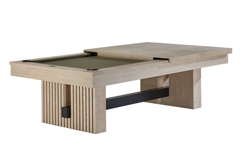 The Vancouver pool table features a modern mix of materials and textures highlighting its fresh and contemporary design. A wood batten-style base with a powder-coated metal beam completes the clean, organic aesthetic. Pair this billiard table with a dining conversion top for ultimate entertaining. This pool table features white pearlized diamond rail sights, robust construction, and internal drop pockets.